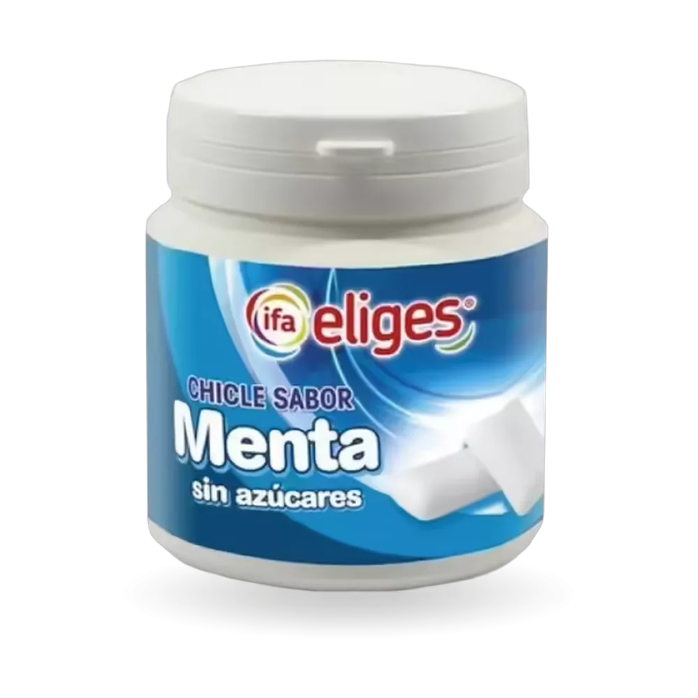Chicle menta sin azúcar (Ifa Eliges) bote de 100 g. Chicles (goma de mascar) sabor menta, sin azúcar, endulzados con edulcorantes, en bote de 100 gramos, de la marca Ifa Eliges. Proporcionan un aliento fresco y duradero. Ingredientes típicos: Goma base, edulcorantes (sorbitol, xilitol, maltitol, aspartamo), aroma, espesante, colorante. Puede contener una fuente de fenilalanina. Conservar en lugar fresco y seco.