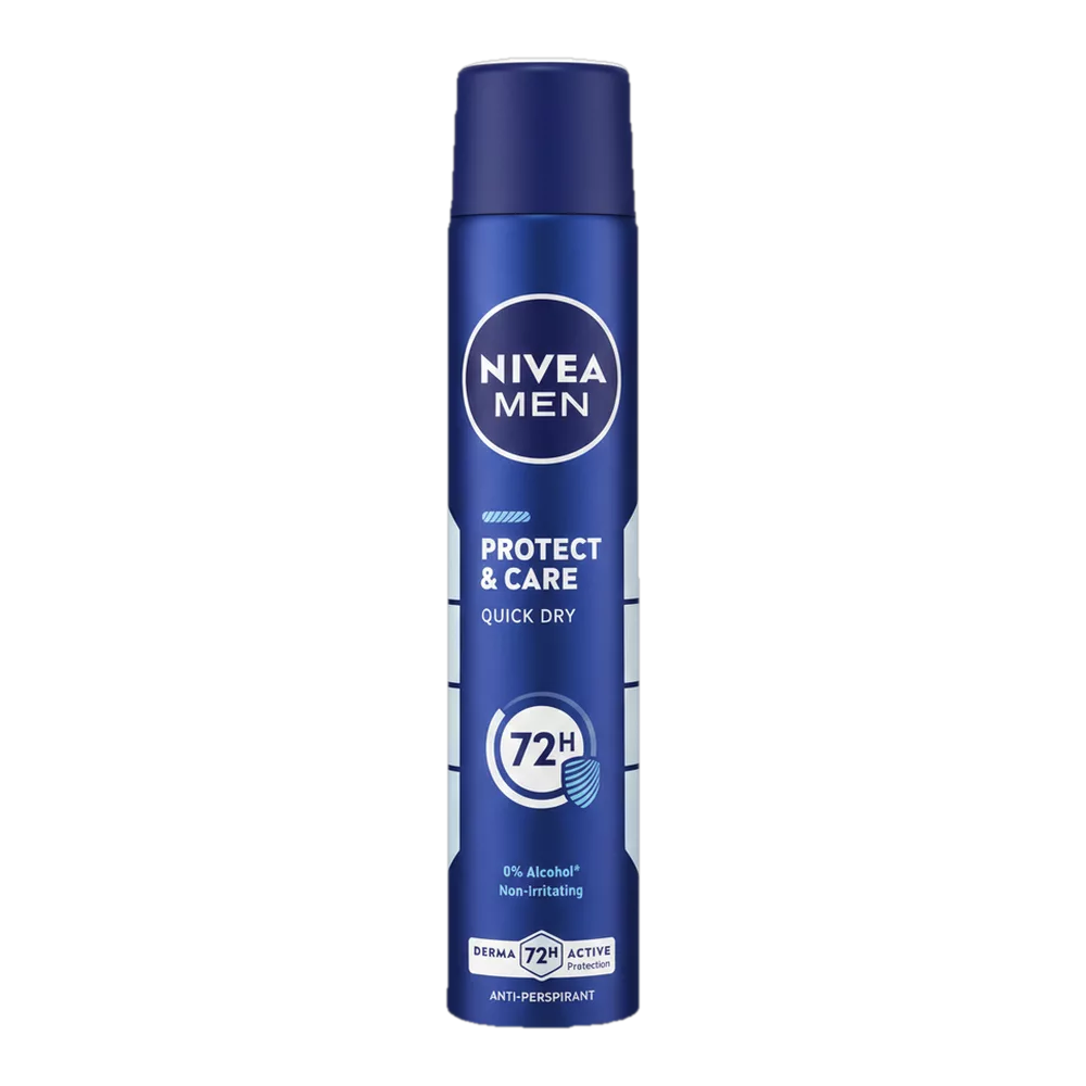 Envase de 200 ml de desodorante protección y cuidado (protect & care) for men de la marca Nivea. En spray. Operador: Nivea.