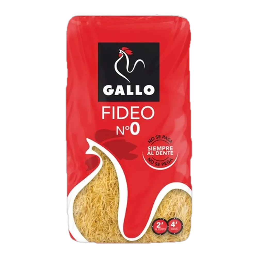 Paquete de 400 g de fideo n.º 0 (fideo muy fino) de la marca Gallo. Pasta para sopa. Ingredientes: Sémola de trigo duro. Cocer en caldo durante 3-5 minutos. Conservar en lugar fresco y seco. Operador: Gallo.