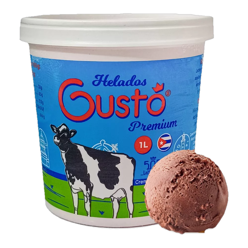 Envase de 1 litro de helado de chocolate de la marca Gusto. Formato individual. Conservar a -18°C. Operador: Gusto.