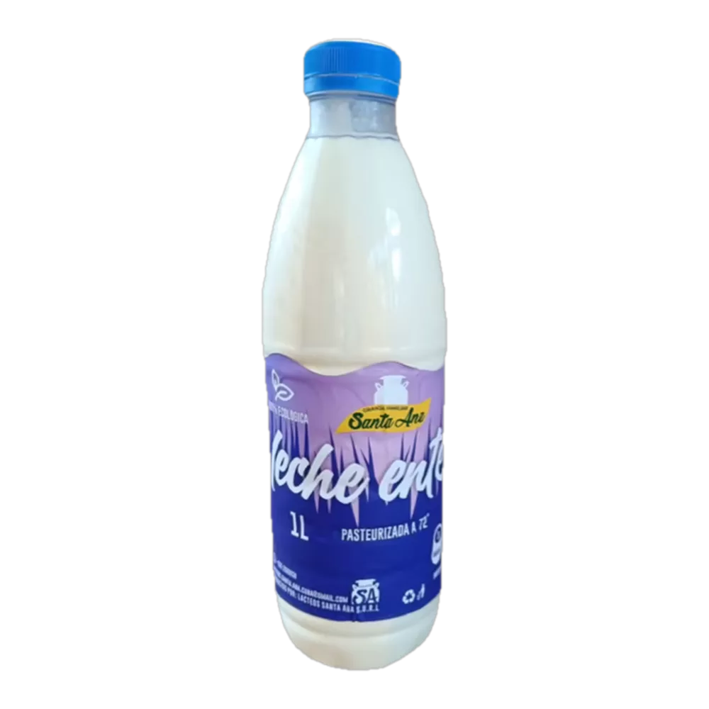 Pomo de 1 litro de leche fluida (pasteurizada o UHT) de la marca Santa Ana. Leche de vaca entera, semidesnatada o desnatada (no especificado). Conservar refrigerado (si es pasteurizada) o en lugar fresco y seco (si es UHT) hasta su apertura. Operador: Santa Ana.