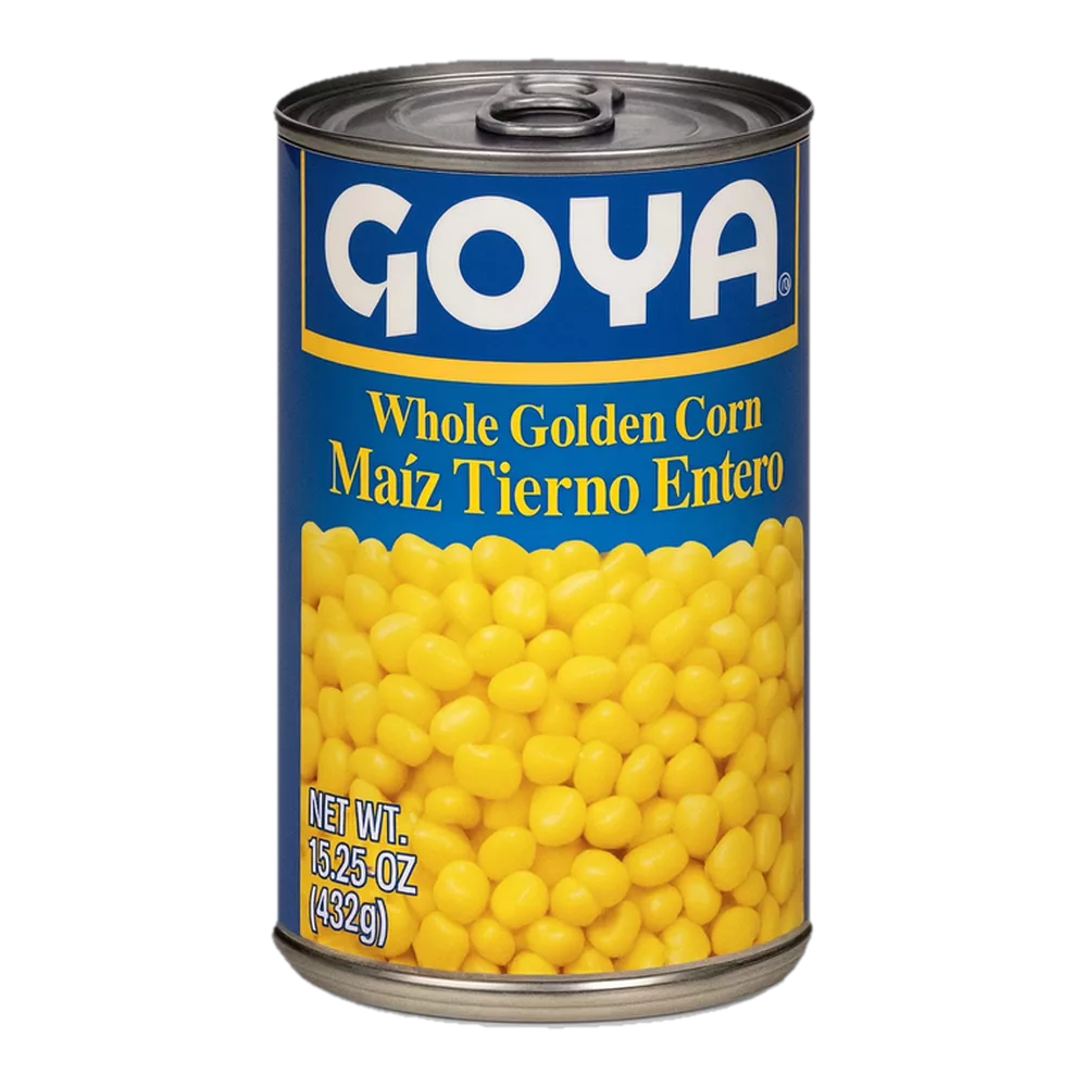 Lata de 15.25 oz (432 g) de maíz tierno entero (golden corn) de la marca Goya. Maíz en grano. Operador: Goya .