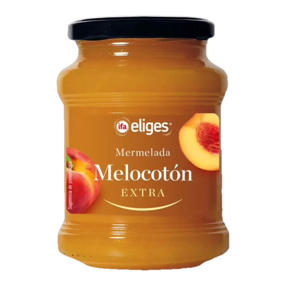Tarro de 410 g de mermelada de melocotón de la marca Ifa Eliges. Ingredientes: Melocotón, azúcar, zumo de limón, pectina. Conservar en lugar fresco y seco. Una vez abierto, mantener refrigerado. Operador comercializado por Ifa Eliges.