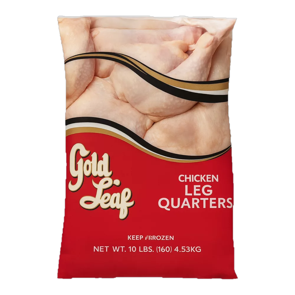 Paquete de 4.54 kg (10 lb) de muslo y contramuslo de pollo de la marca Gold Leaf. Pollo fresco o congelado. Ideal para asar o guisar. Conservar refrigerado o congelar. Operador: Gold Leaf.