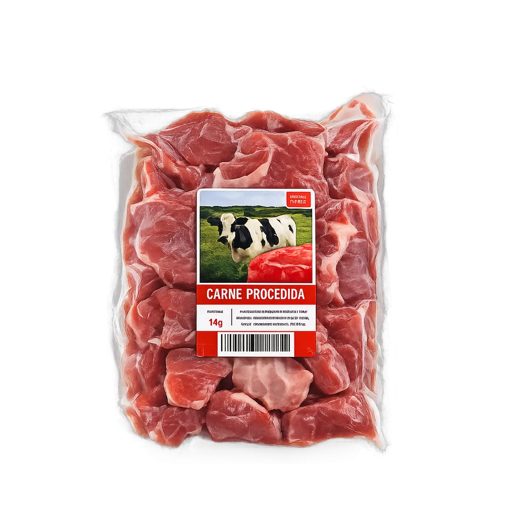 Paquete de 1 kg de carne troceada de res de la marca Cárnicos Habana. Tacos para guisar. Conservar refrigerado o congelar. Operador: Cárnicos Habana.