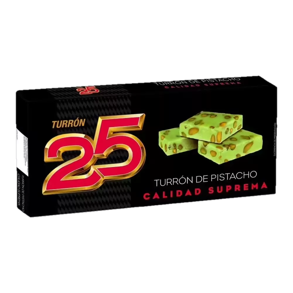 Tableta de 150 g de turrón de pistacho de calidad suprema, de la marca Turrón 25. Turrón blando o duro con pistachos, de alta calidad. Conservar en lugar fresco y seco. Operador: Turrón 25.
